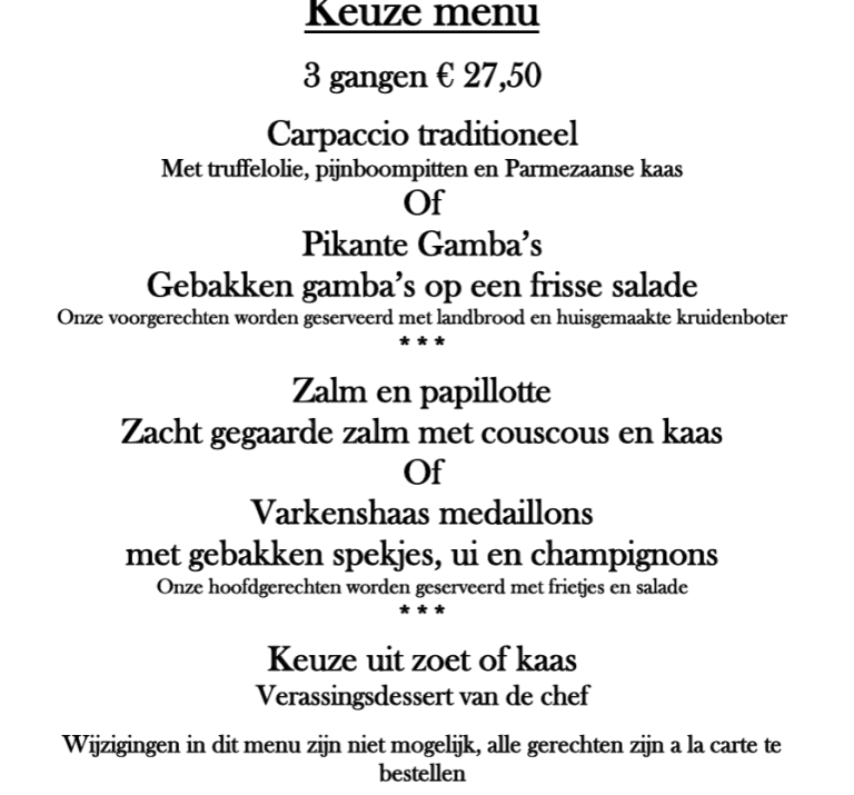 Gewenste wijziging in het menu i.v.m. allergie of dieet, moeten bij de inschrijving worden gemeld.
