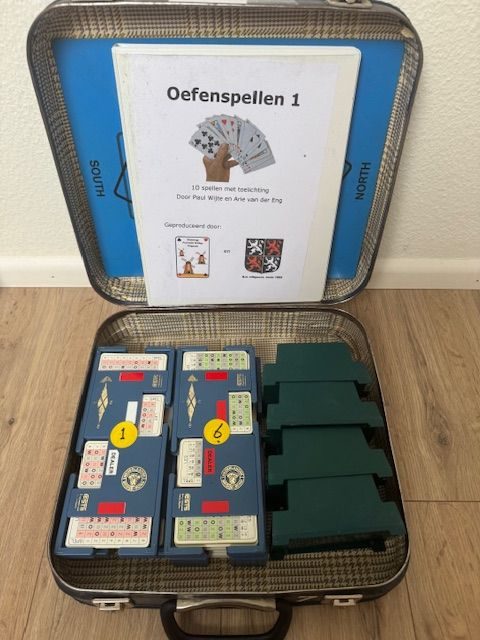 We beschikken over koffers met ieder 10 oefenspellen met een zeer uitgebreide toelichting. Het is de bedoeling om veel tijd te besteden aan het doornemen van de toelichting bij de spellen. Reken voor het spelen en bespreken van een spel ca. 20 minuten. Bij deze koffers gaat het dus niet om te scoren, maar om te leren. De koffer is leerzaam voor zowel beginnende als gevorderde bridgers. De koffers lenen we gratis uit.